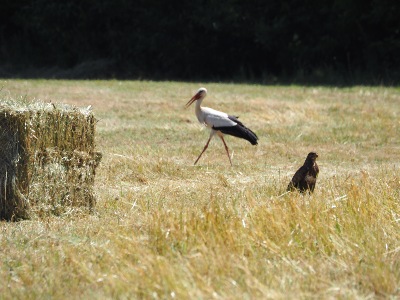 Storch und Mäusebussard Der Storch suchte nach Nahrung auf dem Feld.Der Bussard stand in aller ruhe auf dem Feld bis die Krähen ihn sahen und sofort attackierten.