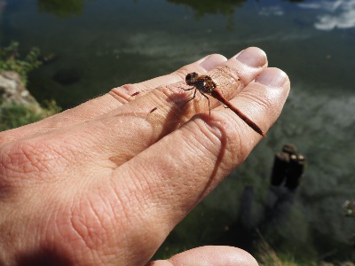 Libelle auf meiner Hand. Ich war im Japanischen Garten in Düsseldorf und hatte mich an den Teich gesetzt.Irgendwann landete die Libelle auf meinen Knie. Sie kam mehrmals wieder und landete immerwieder auf mein Bein. Dann hatte ich versucht ob sie auch auf meiner Hand landet. Nach einer weile und vielen Landungen auf meiner Hand konnte ich mich sogar bewegen und ein paar schritte gehen. Die Libelle kam immer wieder. Ich war völlig beeindruckt von den verhalten.