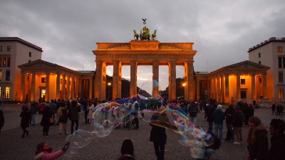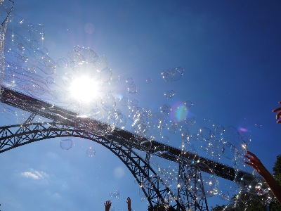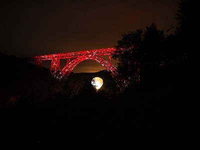Müngsterner Brücke in der Nacht bei der 125 Jahr Feier.Unter der Brücke ist ein Heißluftballon.