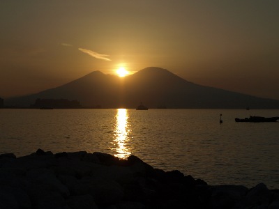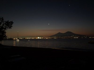 Golf von Neapel vor dem Sonnenaufgang. Der Vesuv mit Mond und Jupiter.